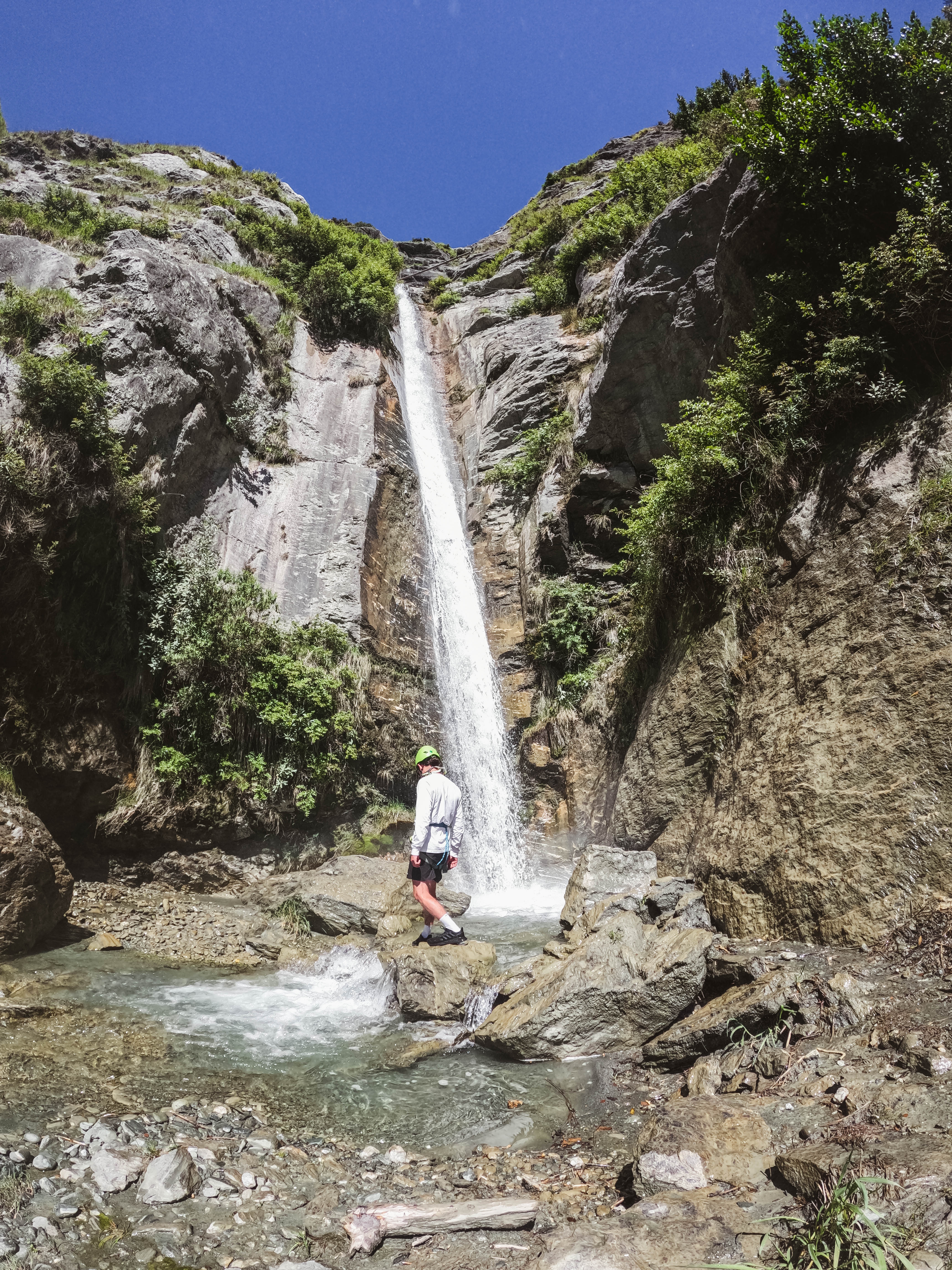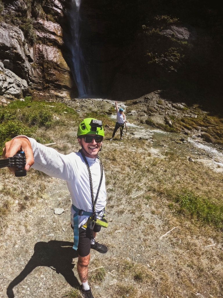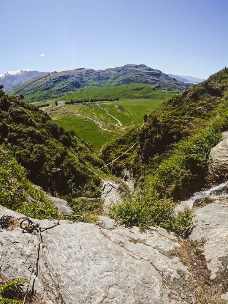 Unclipped and unharnessed we enjoyed the waterfall, you can take a dip if you like and soak in the epic views below. The higher you climb the better the views. We could see straight through the mountains into Lake Wanaka, Gledhu Bay, and down into the Mount Aspiring National Park.